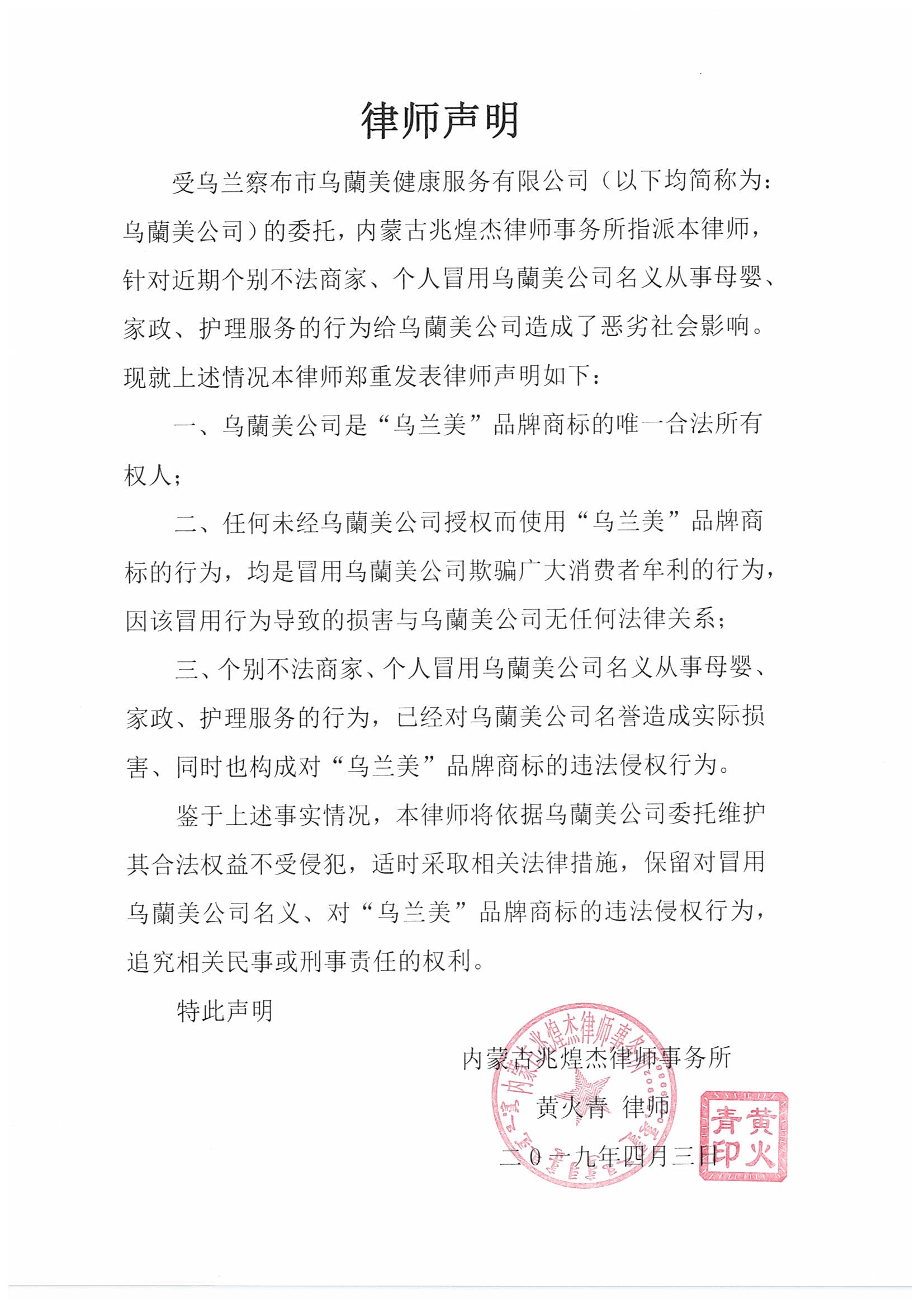 針對近期個別不法商家、個人冒用烏蘭察布市烏蘭美健康服務(wù)有限公司名義從事母嬰、家政、護理服務(wù)的行為,給公司造成了惡劣的社會影響?,F(xiàn)公司委托內(nèi)蒙古兆煌杰律師事務(wù)所黃火青律師,發(fā)表律師聲明如下: